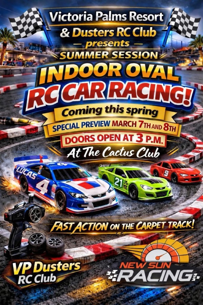 Victoria Palms Resort & the VP Dusters RC Club proudly present the Summer Session of Indoor Oval RC Car Racing!