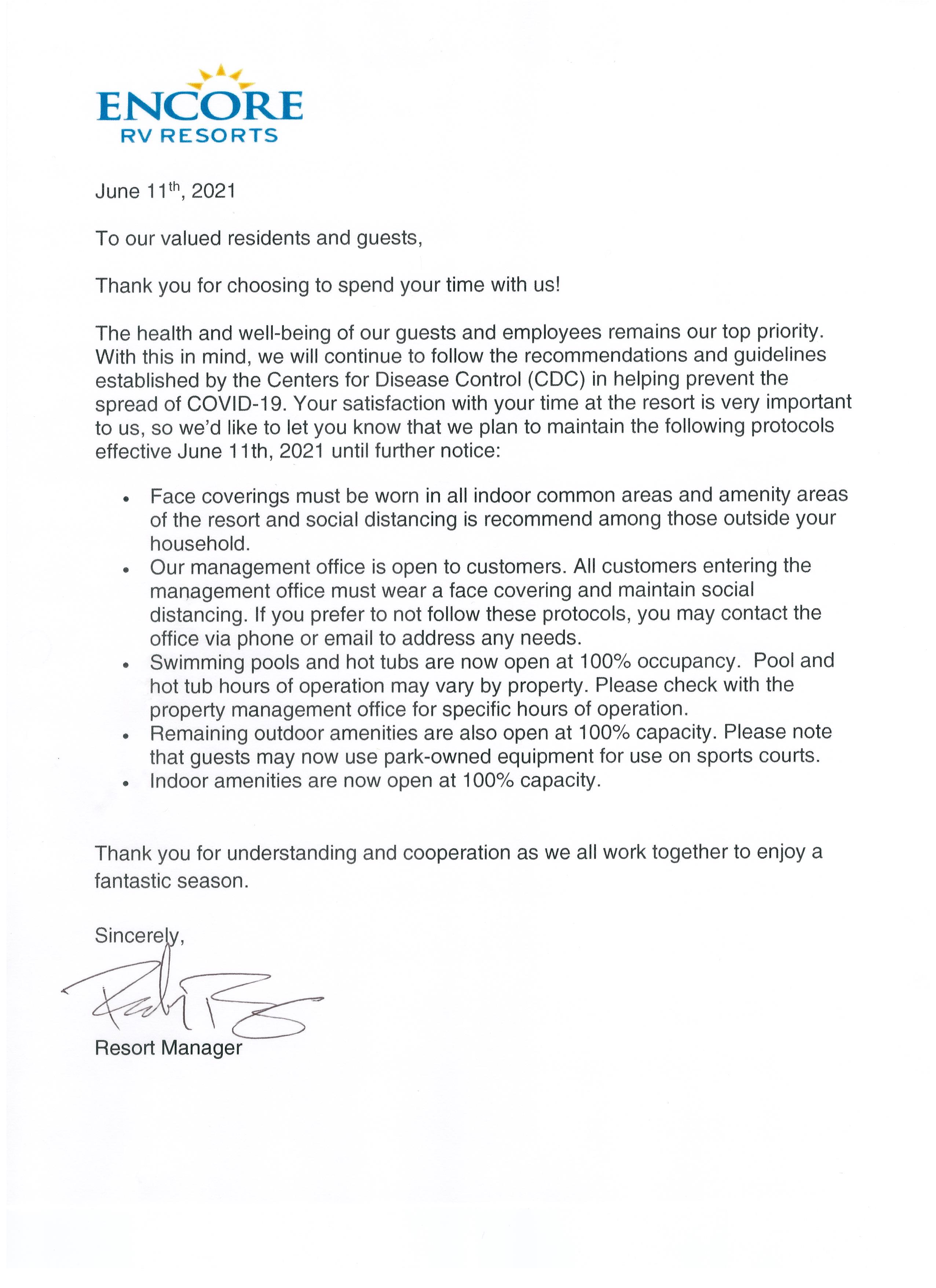 Occupancy Restrictions lifted this Friday, June 11th. June 8, 2021Victoria Palms Resort Please see official announcement below… Download link available below: resident-letter-reopen-texas-6.11.21-v2-1Download
