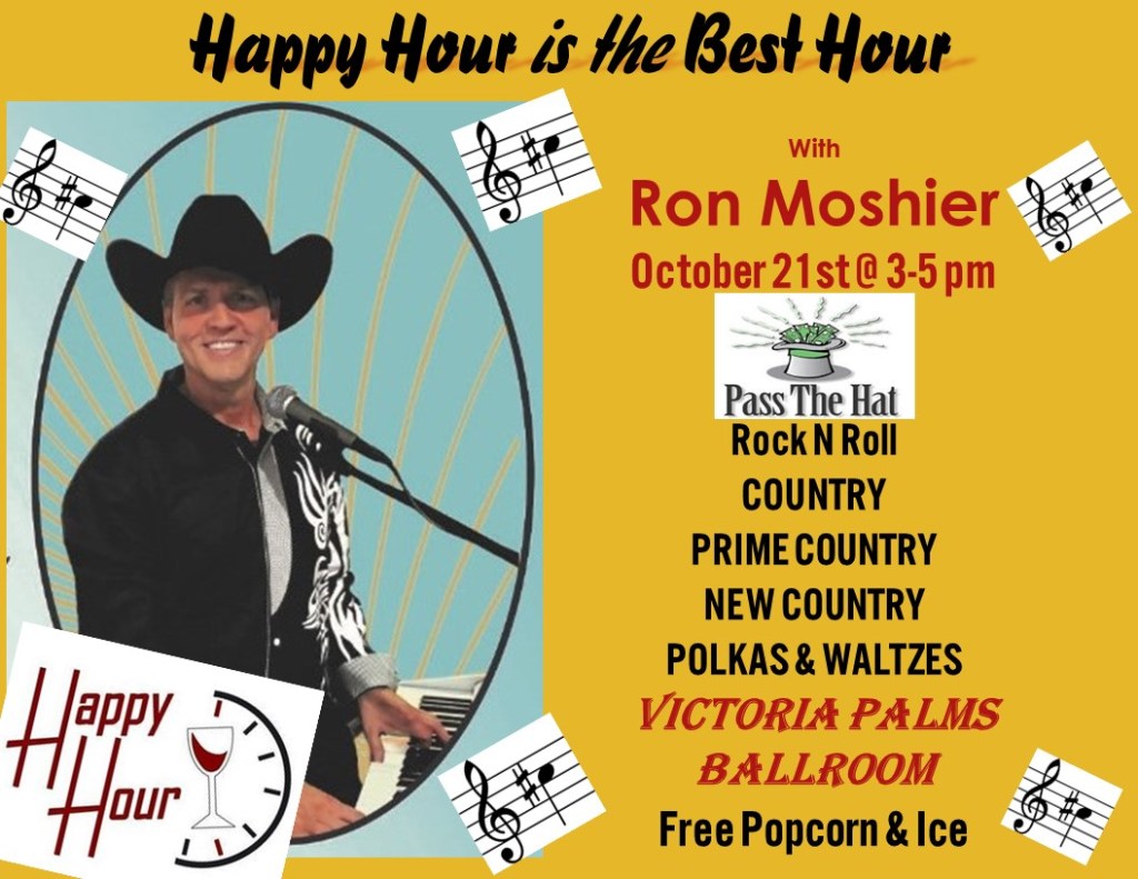 Happy Hour, Thursday – Oct. 21st – 3:00 – 5:00 pm with the fabulous Ron Moshier! Public Invited Image October 20, 2021Victoria Palms Resort