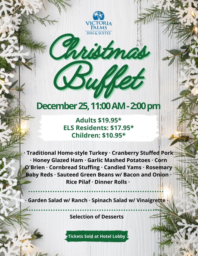 Victoria Palms Christmas Buffet announcement! November 29, 2021Victoria Palms Resort Please see flyer for details. Tickets are on sale now at the Victoria Palms Hotel Lobby. If you have any questions please call the VP Restaurant at 956-782-3200.