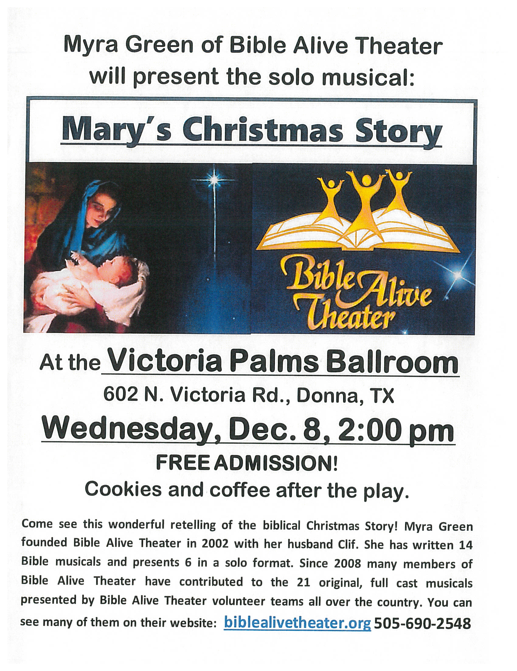 Mary’s Christmas Story 12/8/21 No Charge Ballroom 2:00 pm Image December 1, 2021Victoria Palms Resort
