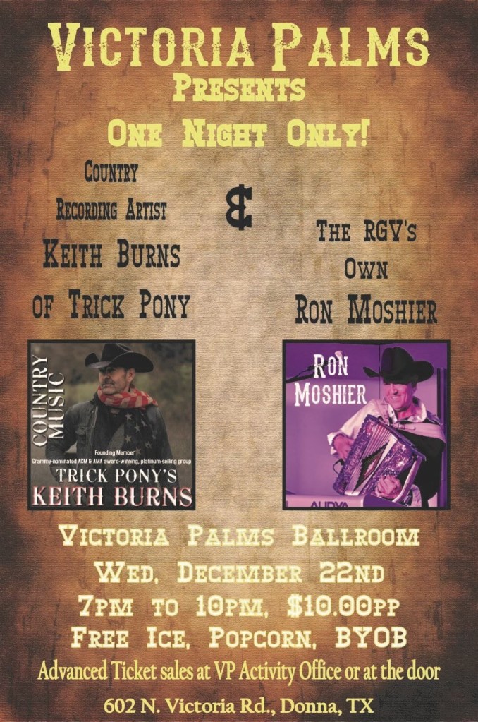 Come on out and see Keith Burns and Ron Moshier perform tonight! Ticket sales $10 at the door! :D Image December 22, 2021December 22, 2021Victoria Palms Resort
