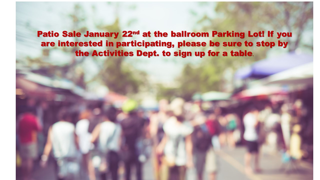 Patio Sale Jan. 22nd @ the Ballroom Parking Lot Image January 13, 2022January 13, 2022Victoria Palms Resort