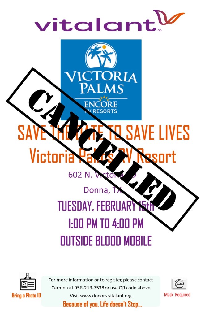 Vitalant Blood Drive 2/15 Update: Cancelled February 14, 2022February 14, 2022Victoria Palms Resort The representative for Vitalant Blood Drive has made the decision to cancel the event as a result of low participation.
