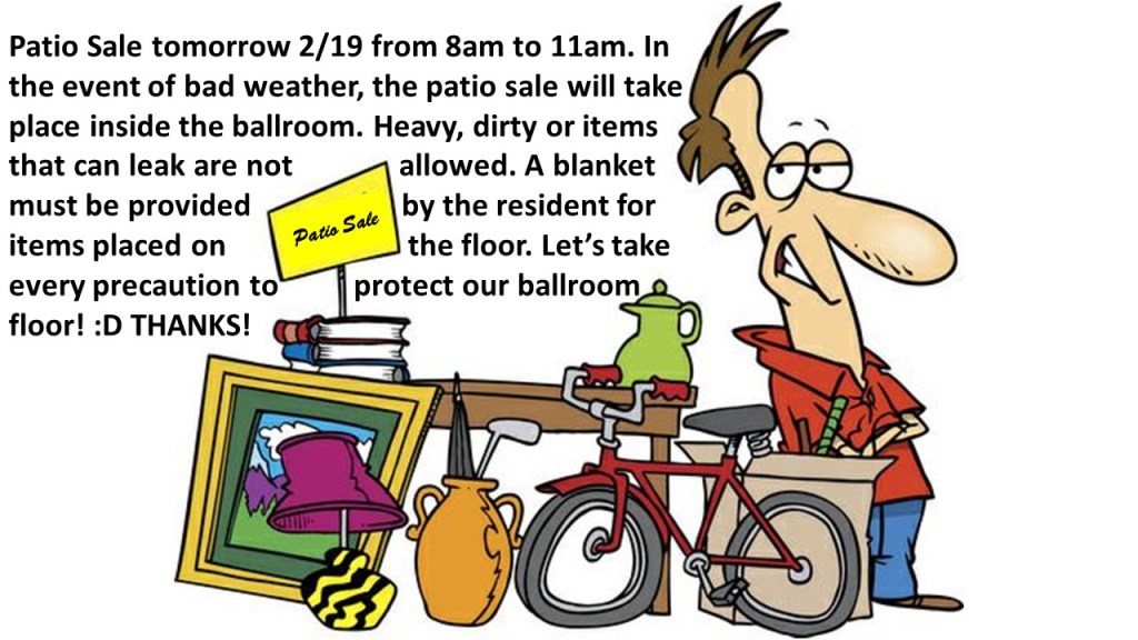 Patio Sale 2/19 8am – 11am