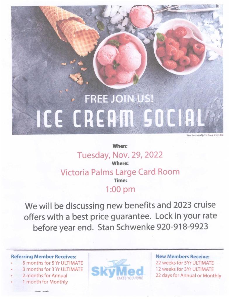 Sky Med Ice Cream Social 11/29/22 1-2pm November 21, 2022Victoria Palms Resort If interested, please sign up at the activity office or call Stan Schwenke @ (920) 918-9923.