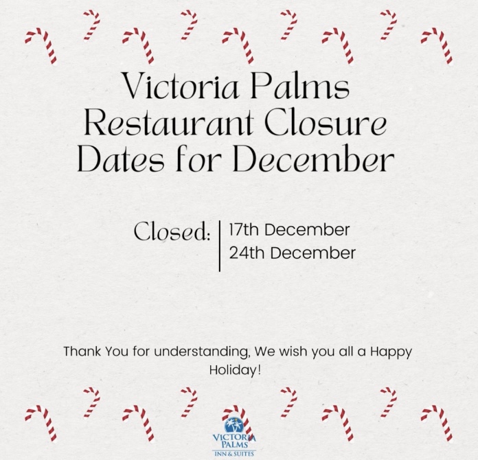 Victoria Palms Restaurant December 14, 2022December 14, 2022Victoria Palms Resort Please be advised the Restaurant will be Closed on December 17th & 24th.