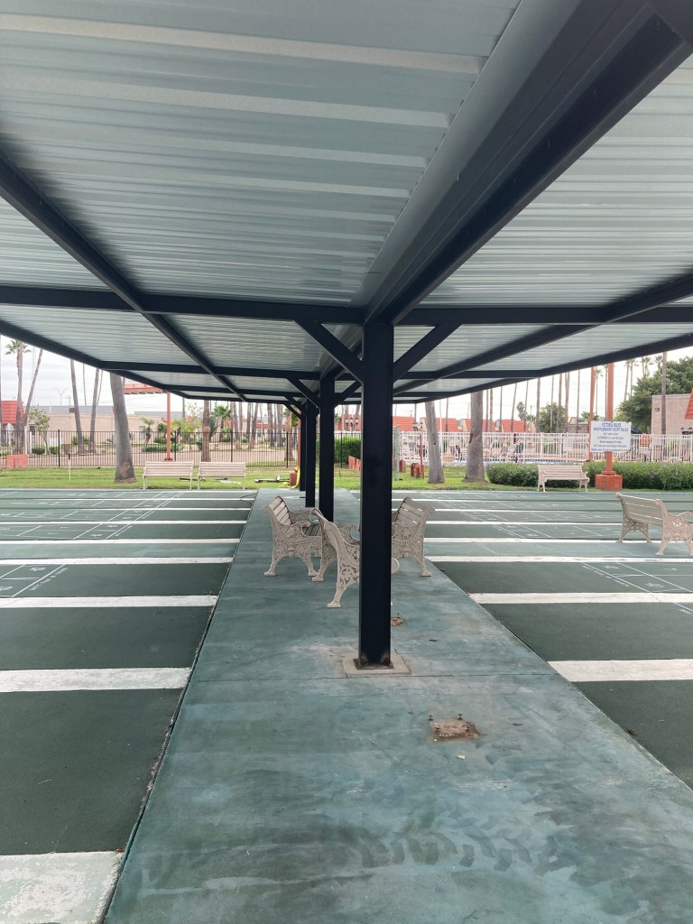 The awning is complete! There are a few more details to finish up, such as painting the gutters, remounting the scoreboards and realigning the benches, but the entire project will soon be finished!