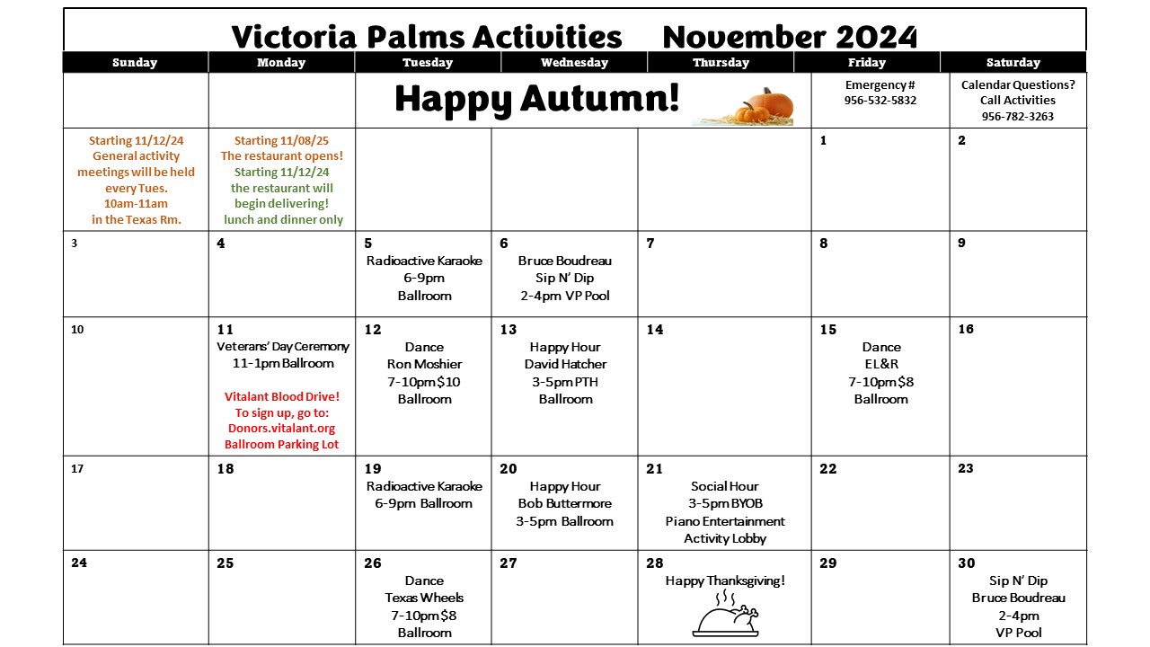 November Calendar November 4, 2024Victoria Palms Resort Please note an edit in the November calendar. The Vitalant Blood Drive will be hosted on Monday the 11th, not on the 14th.