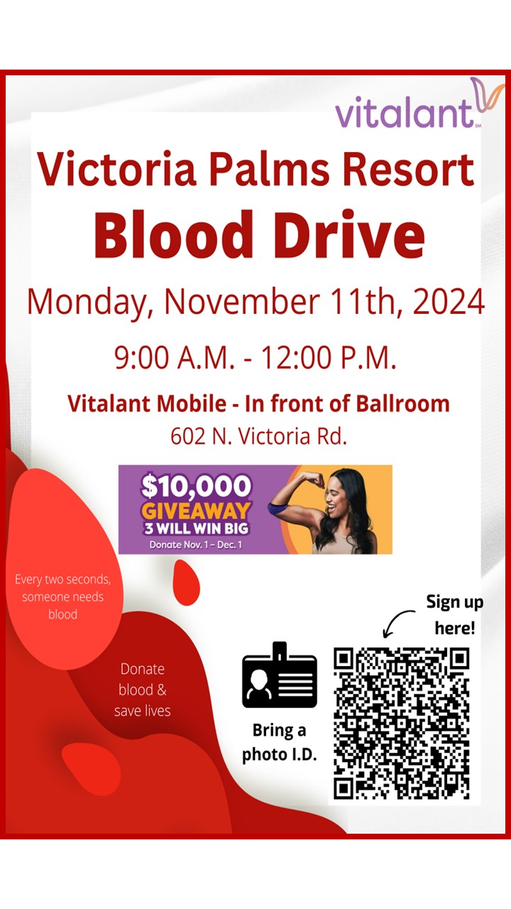 Vitalant Blood Drive 11/11/24 9am – 12pm @ the Ballroom Parking Lot Image November 4, 2024November 5, 2024Victoria Palms Resort