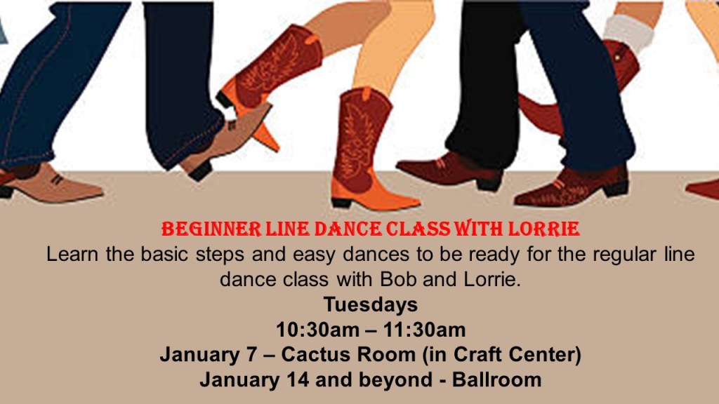 Beginner Line Dancing Update! January 2, 2025Victoria Palms Resort January 7th, Beginner’s Line Dancing will be held in the Cactus Room. January 14th and beyond it will be held in the ballroom.