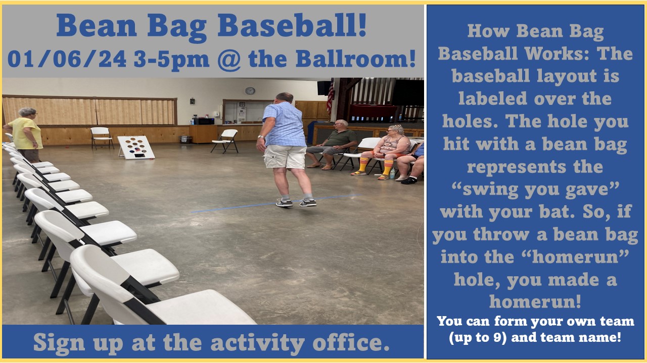 Bean Bag Baseball News! January 4, 2025Victoria Palms Resort If you’re interested in participating, sign up at the Activity Office on Monday before 2pm.