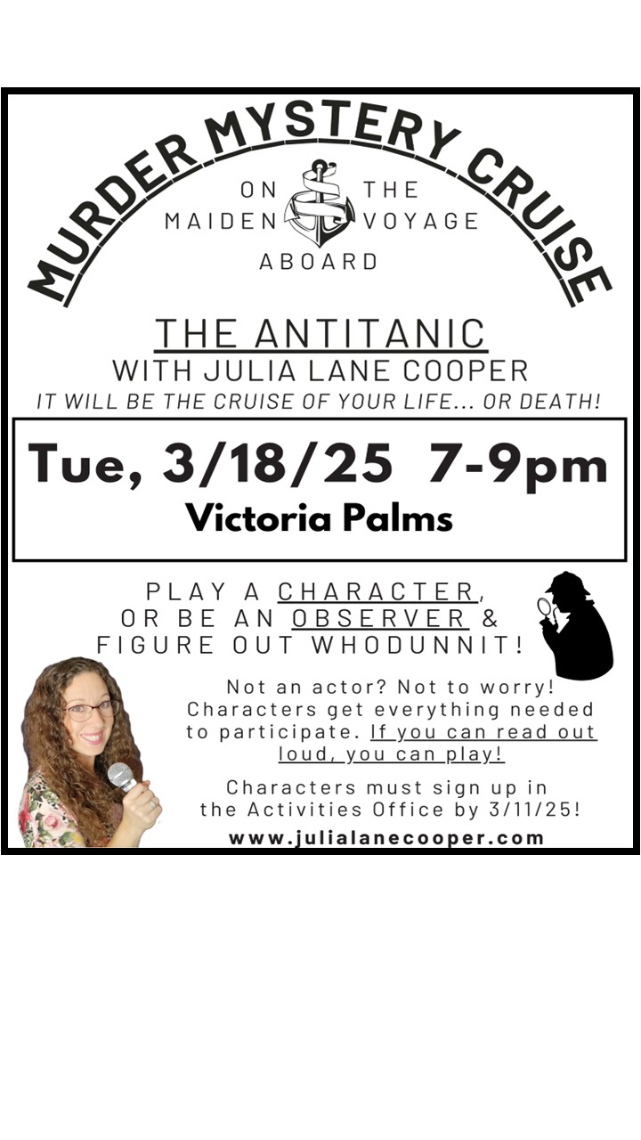 The Activity Department will be hosting a Mystery Theater Party with Julia Lane Cooper March 18th 7-9pm @ the Ballroom! Tickets are $10 and you can participate in the mystery or just be an observer. Appetizers will be served. If you would like to participate in the mystery, please sign up at the Activity Office. (For VP residents only).