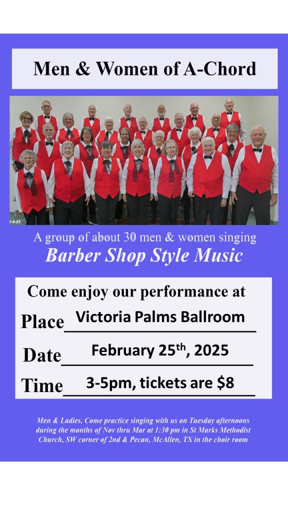 Reminder! Men & Women of A Chord Today at 3pm! $8 @ the Ballroom Image February 25, 2025February 25, 2025Victoria Palms Resort