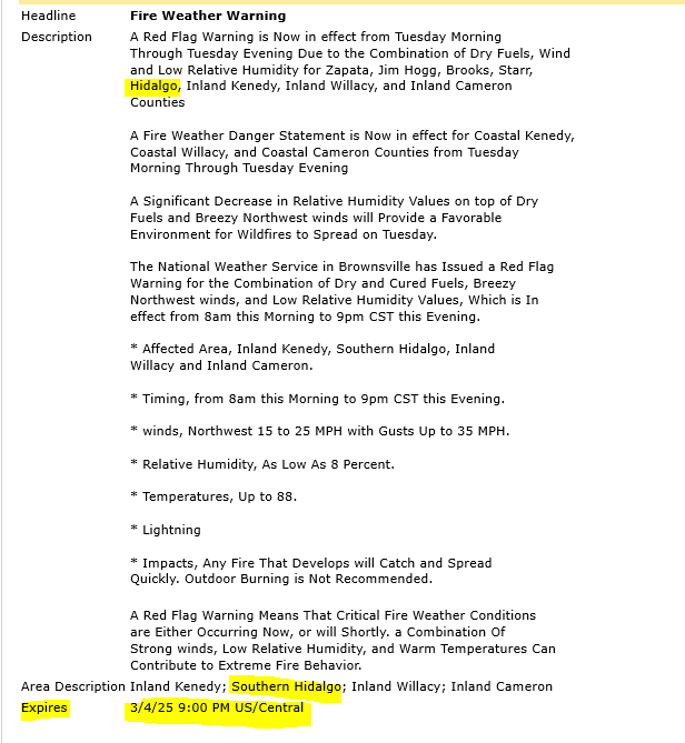 Weather Update March 4, 2025Victoria Palms Resort March 4, 2025Victoria Palms Resort National Weather Advisory for Hidalgo issued today 3-4-25. Please be cautions and do not use open flames outdoors.
