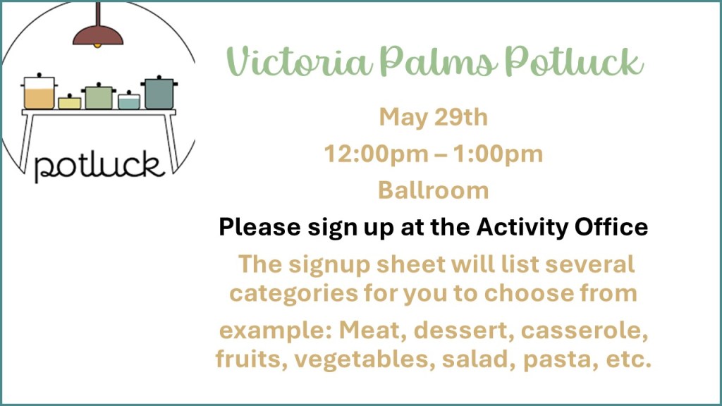 Taste Of Home Potluck News! Image May 21, 2025May 21, 2025Victoria Palms Resort Bring a dish from your home state!