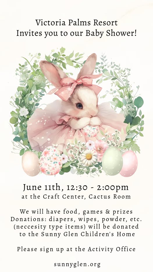 Victoria Palms is hosting a baby shower fundraiser for the Sunny Glen Children’s home in San Benito. They have requested necessity type items, such as diapers, wipes, powder, lotion etc. Bring donation items to the event or drop them off at the Activity Office. There will be food, games and prizes. Sign up at the Activity Office.