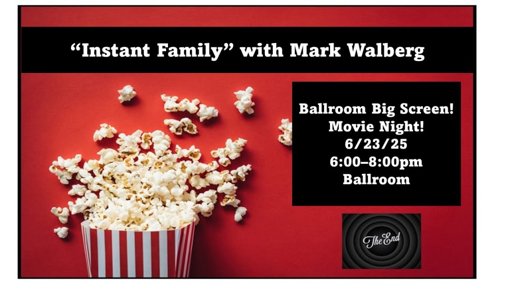 Movie Night Reminder! June 23, 2025Victoria Palms Resort Tonight 6-8pm @ the Ballroom, “Instant Family” with Mark Walberg on the Ballroom Big Screen! We will have ballroom chairs out, but you’re welcome to bring your own too! Concessions will be available.