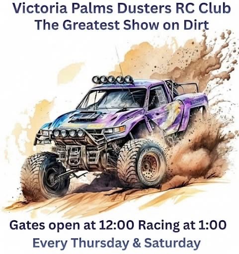 Race fans, Thursday is raceday at VP Dusters Park. Come on out from 1 to 3 and race those winning cars or cheer on your favorite racers. Going to be a beautiful and warm day. See ya there. January 8, 2026Victoria Palms Resort