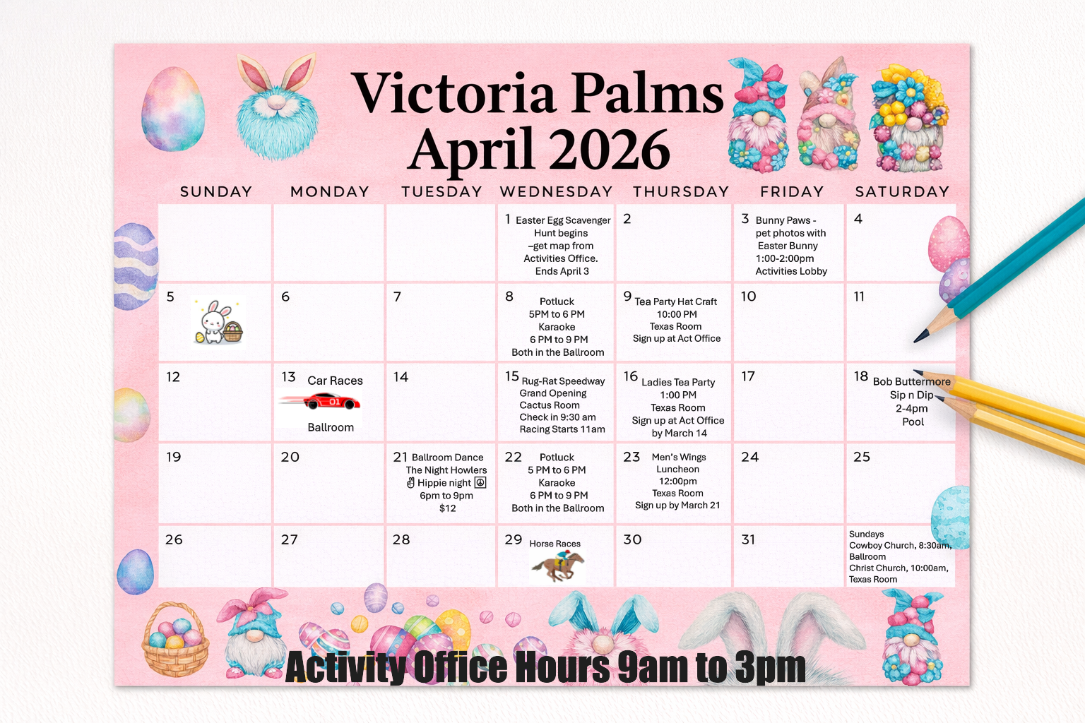 Spring is hopping at Victoria Palms, and we have a full month of fun planned for everyone! Join us for great entertainment, games, dances, food events, and seasonal favorites all throughout April.