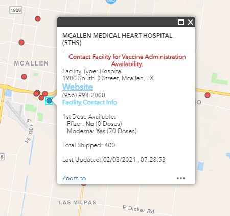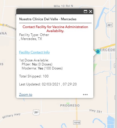 Walmart has begun receiving vaccines for distribution in Texas and as of Feb 10th the closest location available is in Brownsville however, we are providing you this link for future reference. Please check their website regularly for updated information. This info has also been added to the Vaccine Information tab of our website.