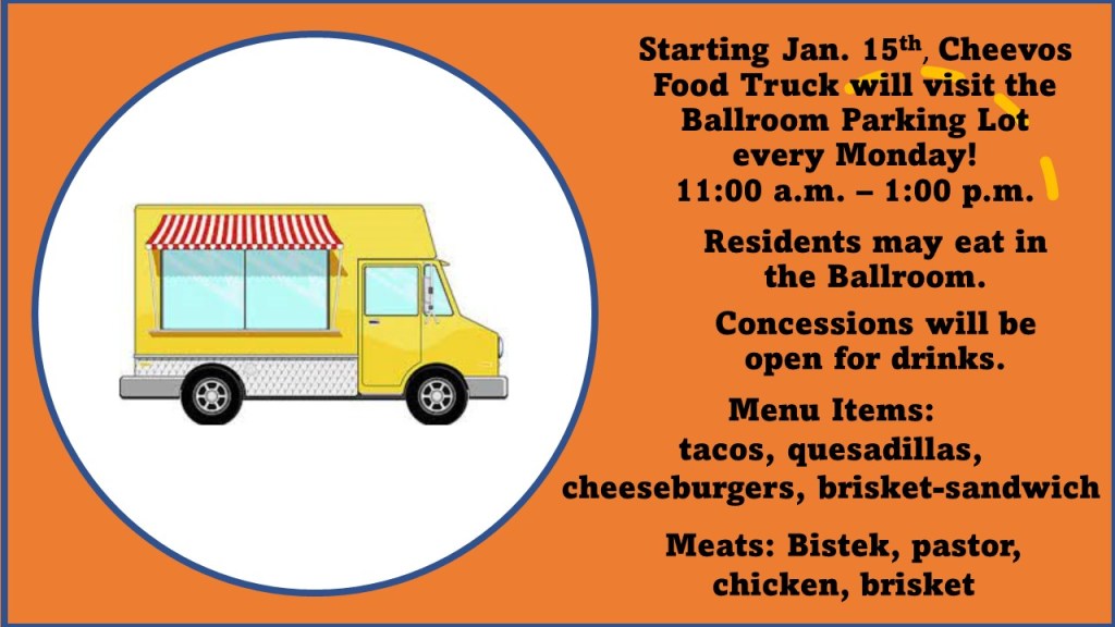 Cheevos food truck will not be arriving today. The Activity Dept. apologizes for the inconvenience.