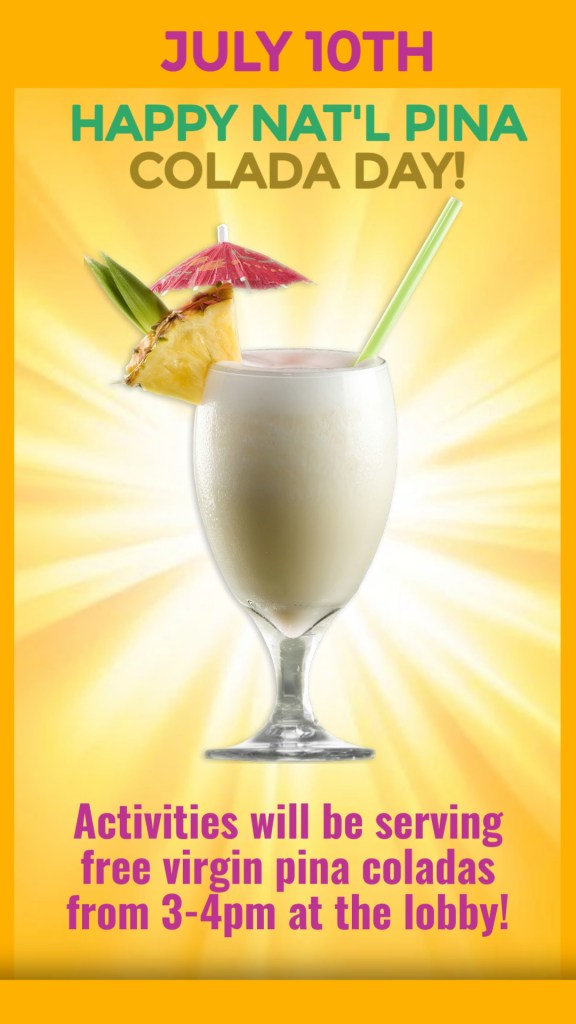In honor of National Pina Colada Day, the Activities Office will be serving free virgin Pina Coladas 7/10 3-4pm at the activity lobby! (while supplies last!)