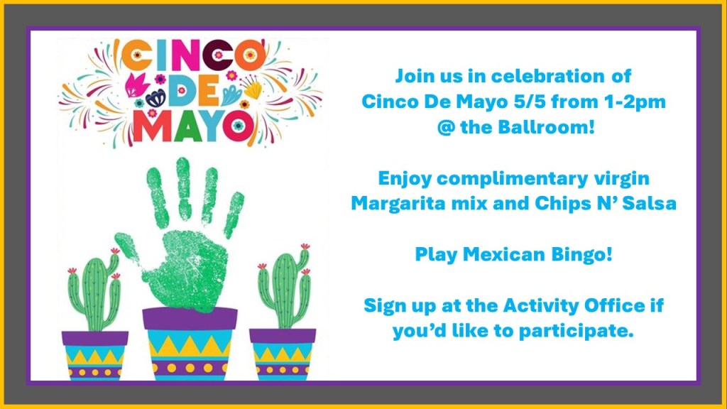 These are the supplies that will be used to host the Paint N’ Sip 5/19 2-4pm @ the Craft Center, Cactus Room $25. If you’re interested in participating, sign up at the Activity Office.